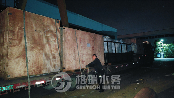 今天發貨的設備包括多介質過濾器、刮泥機、板框壓濾機、加藥裝置、風機、電控柜等安裝配件。因通過海運運輸,設備用木箱進行打包,現場看到工程人員安全有序的操作著行車裝車,裝卸組人員配合著裝車,裝車后大車緩緩的駛出廠區發往青島港口。