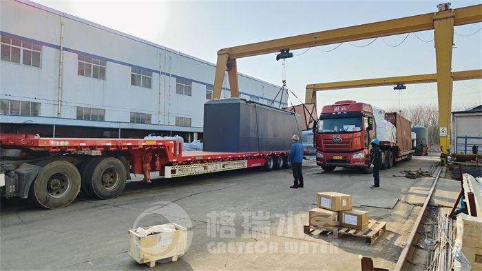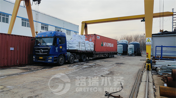 此次發(fā)貨的是工程濾料、膜元件、EDI模塊等設備,滿裝5輛大車運往連云港港口,格瑞水務設備智能、高效、節(jié)水節(jié)能、品質優(yōu)良。